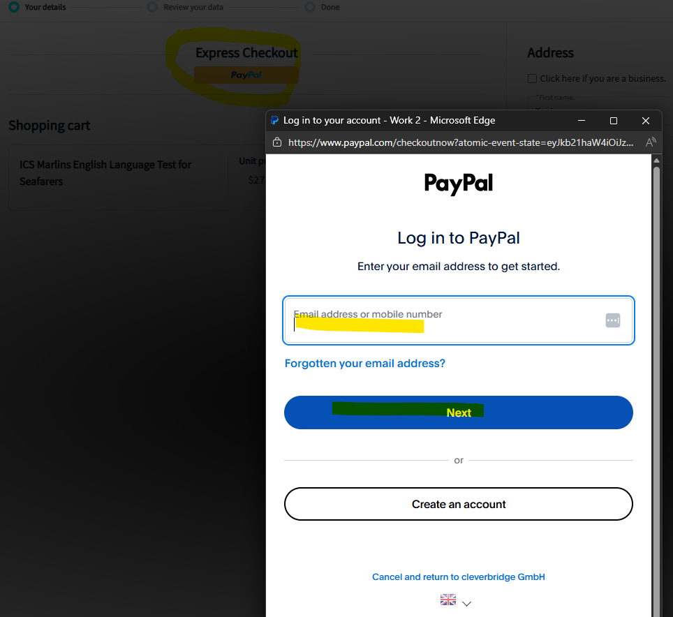 On the next page click 'PayPal' under Express checkout. Enter your PayPal account details in the pop up window.